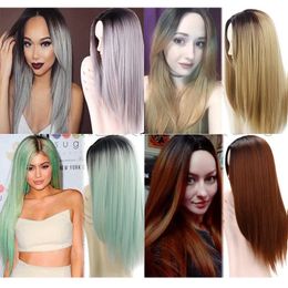 Hot Sexy Ombre Lange Gerade Mittelteil Frisur Warme Synthetische Faser Spitze Front Perucken Schwarz Grun Grau Gelb Rotbraun Fur Frauen